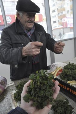 – culese cu atenție dis-de-dimineață din Itești, urzicile își așteaptă cuminți clienții, grupate în grămăjoare – băcăuanii vin să le cumpere pentru o ciorbă sau pentru faimosul pilaf cu urzici