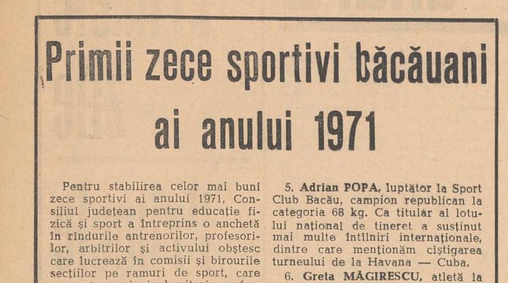 În primul număr din 1972, ziarul Steagul Roșu publica tradiționalul clasament al celor mai buni zece sportivi băcăuani ai anului precedent. Era mai mult decât un simplu top: era o recunoaștere oficială a excelenței sportive într-o perioadă în care performanța era strâns legată de prestigiul comunității și al județului.