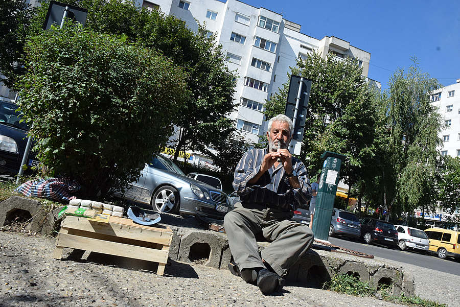 Cauți sursa și nu o găsești. Abia când îi găsești urma, dai peste o mogâldeață de om, adăpostită la umbra unor arbuști ornamentali. Cu ochii închiși, unde numai degetele umblă, Gheorghe Dumitru se regăsește într-o lume numai de el știută. În față, pentru trecători, expusă pe un carton, oferta de produse este limitată: pietre din spumă de mare (pentru călcâie muncite), ace de cusut și clame (cârlige) de rufe.