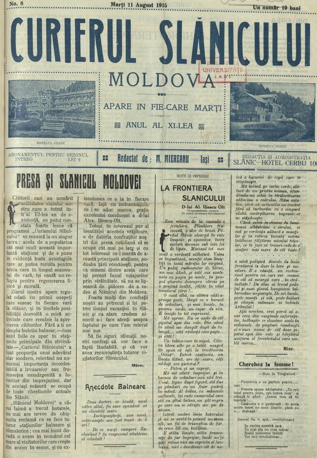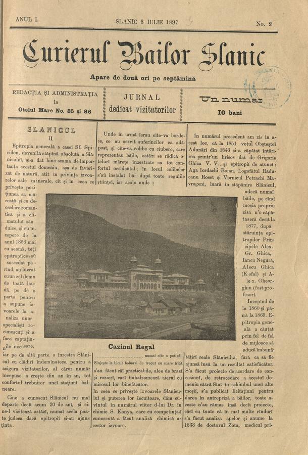 Și iată că, în vara anului 1897, pe când așezământul era administrat de Epitropia ,,Sfântul Spiridon” din Iași, vilegiaturiștii aflați în stațiunea Slănic-Moldova luau cu asalt chioșcul cu ziare, unde era expus primul număr al publicației ,,Curierul Băilor Slănic”, bisăptămânal subintitulat ,,Jurnal dedicat vizitatorilor”, ziar cu o existență estivală, redactat în patru pagini (format 32 x 24 cm).