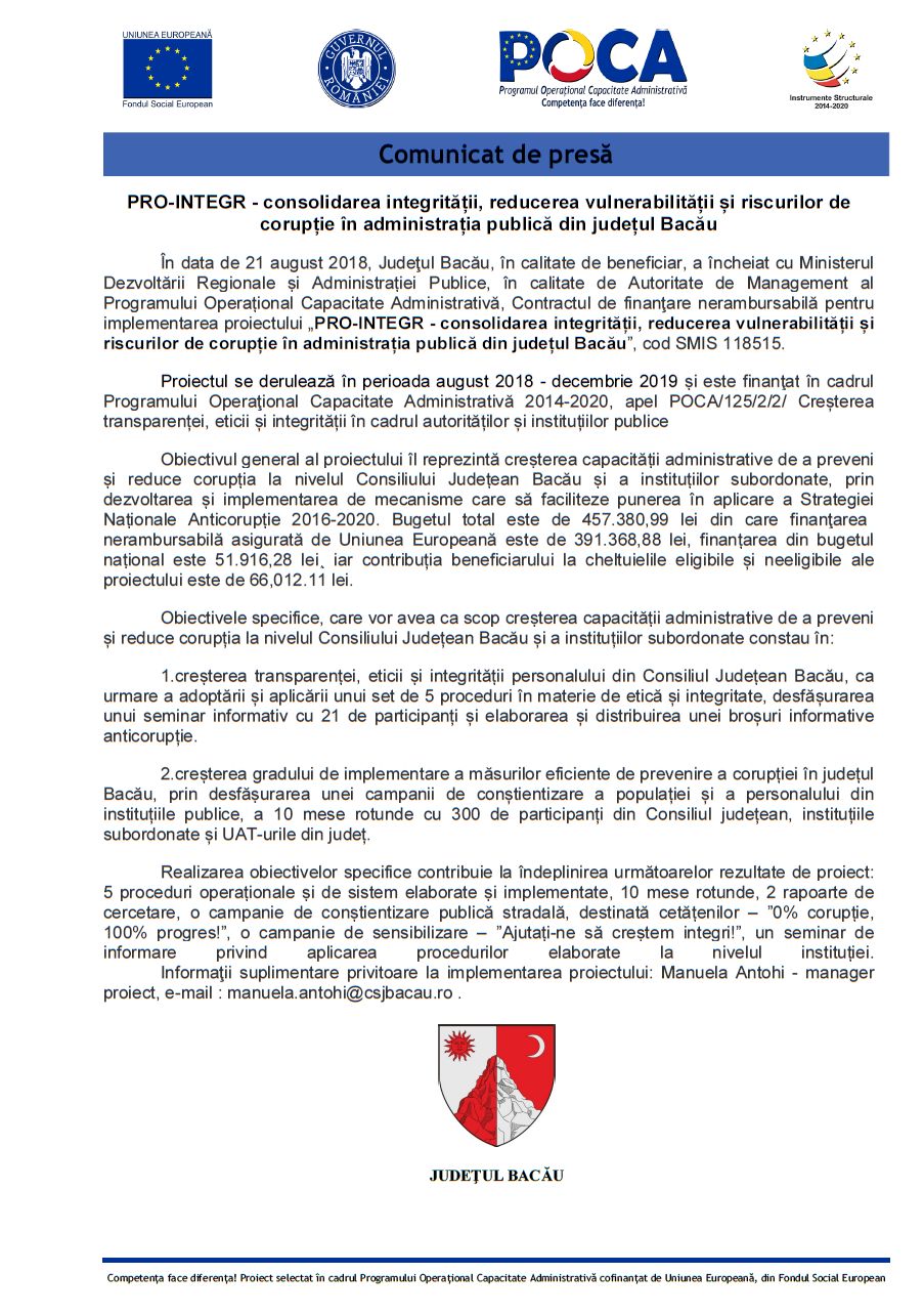 Comunicat de presăPRO-INTEGR – consolidarea integrității, reducerea vulnerabilității și riscurilor de corupție în administrația publică din județul Bacăude Comunicat de presa - 28 august 2018AcțiuneFacebookTwitterWhatsAppTelegramVK