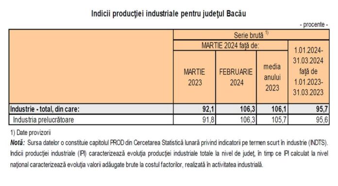 Conform datelor din capitolul PROD al Cercetării Statistice lunare privind indicatorii pe termen scurt în industrie (INDTS), producția industrială totală realizată în județul Bacău în luna martie 2024 a înregistrat o creștere de +6,1% în serie brută față de media anului 2023.