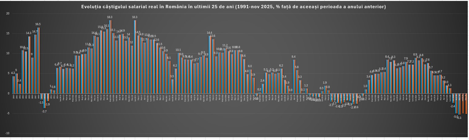 Economistul arată că, de la învestirea noului Guvern, puterea de cumpărare a câștigului salarial mediu net a înregistrat o scădere continuă. Conform informațiilor anunțate de INS, în luna noiembrie 2025 puterea de cumpărare a salariului net a scăzut cu 5,1%.
