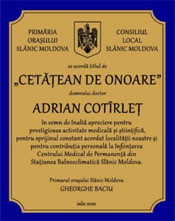 Titlul de „Cetățean de onoare” a fost acordat chirurgului prof. univ. dr. Adrian Cotîrleț „în semn de înaltă apreciere pentru prestigioasa activitate medicală și științifică, pentru sprijinul constant acordat localității Slănic Moldova și pentru contribuția personală la înființarea Centrului Medical de Permanență din Stațiunea balneoclimaterică Slănic Moldova”.