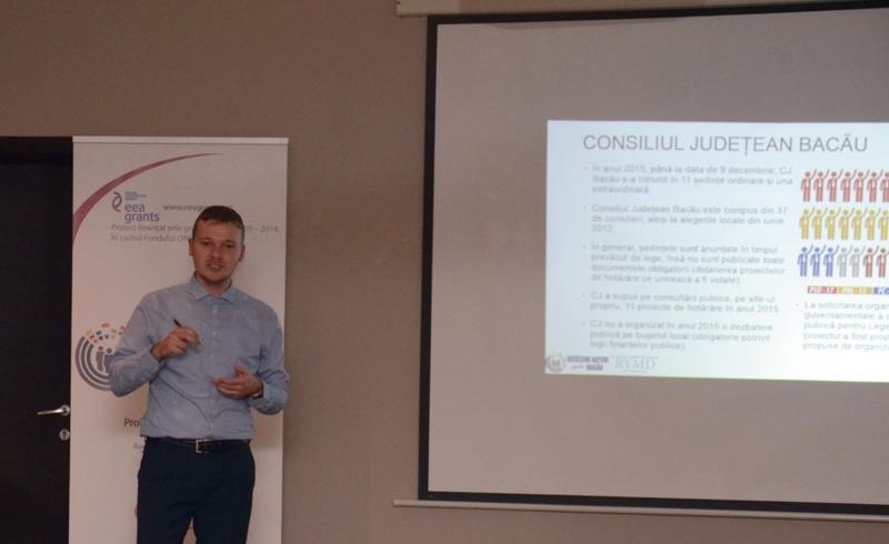 Dintre proiectele aprobate in 2015, 97 la suta au fost initiate de primar si viceprimari. 13 consilieri nu au avut in anul 2015 niciun proiect propus spre dezbatere pe ordinea de zi. Sedintele CJ Bacau “sunt anuntate in timpul prevazut de lege, insa nu sunt publicate toate documentele obligatorii (detalierea proiectelor de hotarâre ce urmeaza a fi votate)”, a constatat echipa RYMD. S-a organizat o dezbatere publica pentru Legea nr. 350/2005 la solicitarea ONG-urilor, dar proiectul a fost propus fara modificarile recomandate de acestea. Executivul a initiat toate proiectele din 2015, mai putin conferirea titlului de cetatean de onoare seismologului Gh. Marmureanu, care apartine consilierilor Ovidiu Stanica si Petrica Mihaila. Din 37 de alesi judeteni, 17 nu au avut nicio interventie in 12 luni. O alta obligatie ignorata de consilieri este cea de a tine audiente lunar cu cetatenii.