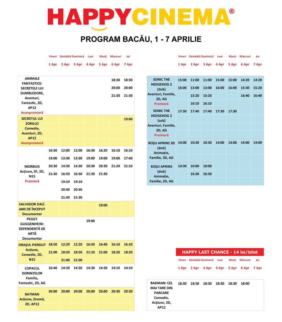 Program Happy Cinema Bacau, 1- 7 aprilie