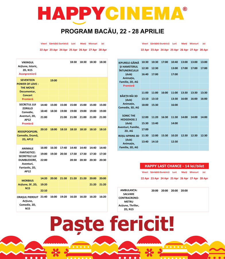 Program Happy Cinema Bacau, 22- 28 aprilie