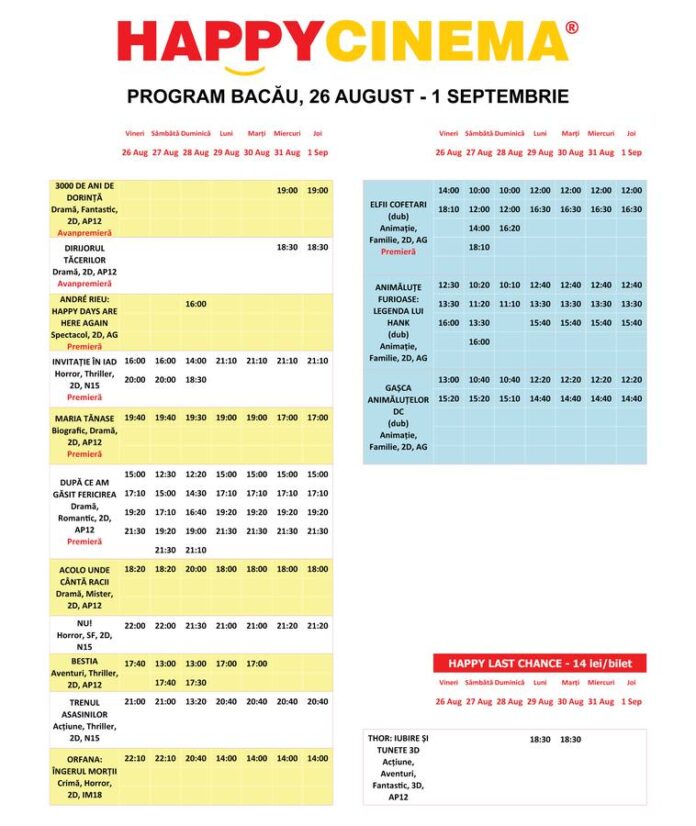 Program Happy Cinema Bacau, 26 august – 1 septembrie