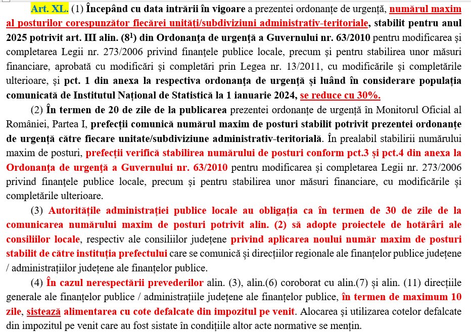 Potrivit textului, începând cu data intrării în vigoare a ordonanței, numărul maxim al posturilor stabilit pentru fiecare unitate administrativ-teritorială ar urma să fie redus cu 30%, raportat la plafonul prevăzut de legislația actuală privind finanțele publice locale.
