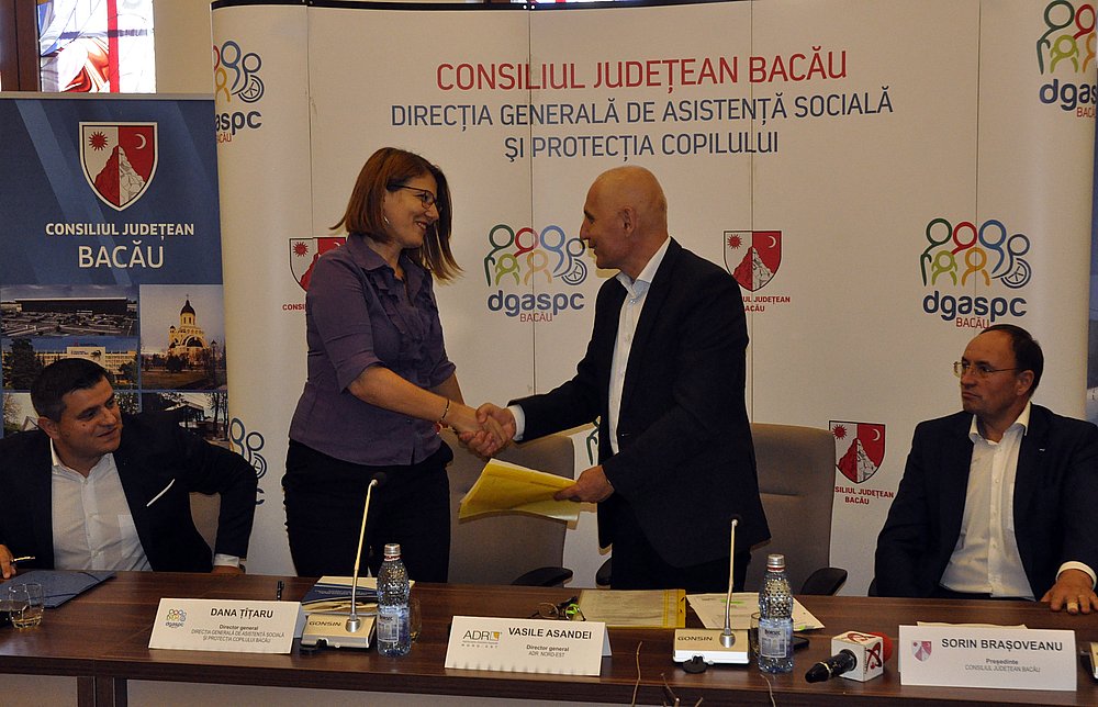 În Sala Mare a Palatului Administrativ a fost semnat, vineri, contractul de finanțare pentru Proiectul „Servicii sociale alternative pentru persoane adulte cu dizabilități”, care vizează extinderea infrastructurii de servicii sociale comunitare pentru dezinstituționalizarea persoanelor cu dizabilități din cadrul Centrului de Recuperare și Reabilitare Neuropsihiatrică Răcăciuni. Au participat Vasile Asandei, directorul general al ADR Nord-Est, Sorin Brașoveanu, președintele Consiliului Județean (CJ) Bacău, Daniela Țîțaru, directorul general al Direcției Generale de Asistență Socială și Protecția Copilului (DGASPC) Bacău, Lucian Cheța, primarul comunei Răcăciuni, dar și echipa de implementare a proiectului din cadrul DGASPC Bacău.
