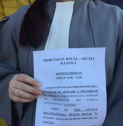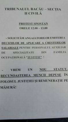 Grefierii şi personalul auxiliar din Tribunalul Bacău – Secţia a II- a Civilă şi de Contencios Administrativ şi Fiscal au organizat, astăzi, un protest spontan, prin întreruperea activităţii în intervalul 12.00 – 13.00.