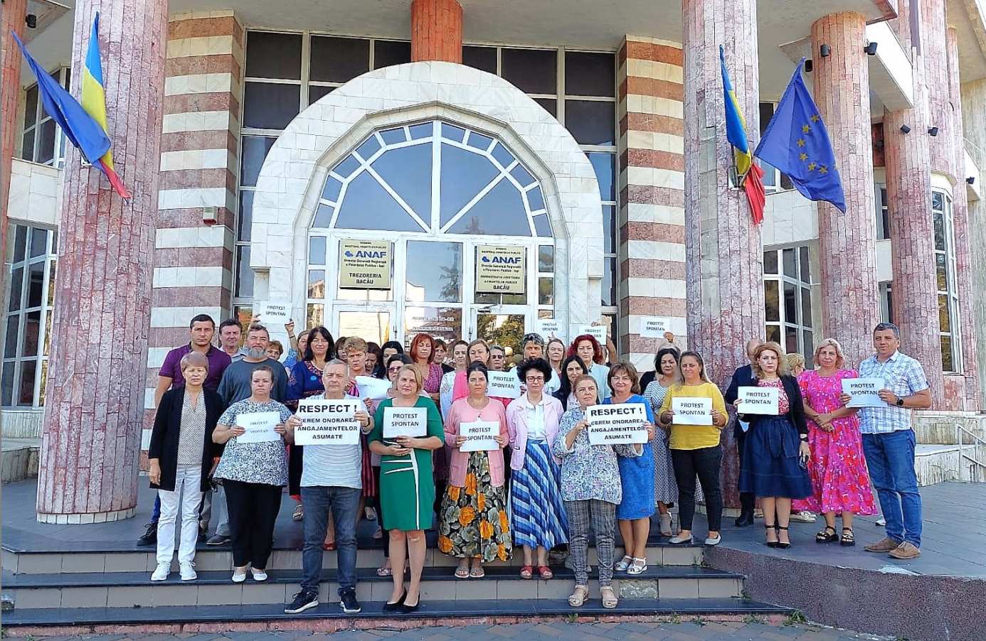 De două zile, salariații Administrației Județene Bacău a Finanțelor Publice protestează spontan. Salariații, membri ai Sindicatului Sed Lex, au ieșit și vineri, 8 septembrie, în fața instituției și au etalat cartoane pe care era scris „Protest spontan” și „cerem onorarea angajamentelor asumate”.