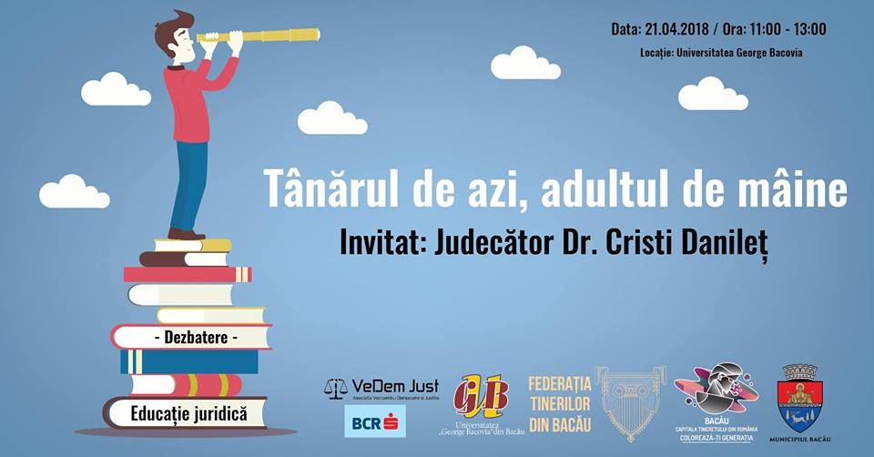 Federația Tinerilor din Bacău organizează sâmbătă, 21 aprilie, două întâlniri care-i vizează pe tinerii băcăuani, întâlniri cu subiecte din cele mai importante. În prima dintre ele, intitualtă „Tânărul de azi, adultul de mâine” și programată de la ora 11.00, cei ce vor fi prezenți vor avea parte de o veritabilă lecție de Educație Juridică, moment ce îl va avea în centrul atenției ca invitat pe judecătorul dr. Cristi Danileț, care va prezenta totodată și noua sa carte „Legea pe interesul tinerilor”, ce conține noțiuni juridice esențiale și necesare atât pentru tineri,cât și pentru adulții preocupați de drepturile lor.