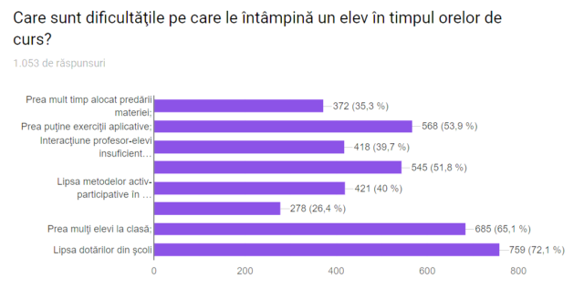 În ceea ce privește dificultățile pe care le întâmpină un elev în timpul orelor de curs, peste 70% dintre repondenți fac referire la lipsa dotărilor din unitățile de învățământ, aproximativ 65% spun că sunt prea mulți elevi la clasă, 53% susțin că sunt prea puține exerciții aplicative, iar 51% se plâng de faptul că materia este prea grea, iar limbajul folosit la clasă are prea mulți termeni specifici.