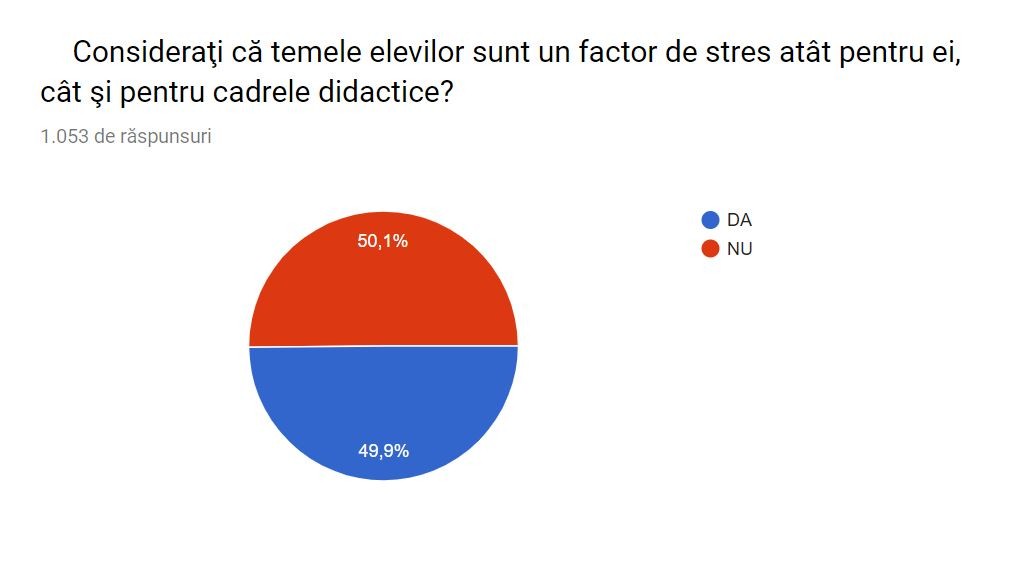 În privința temelor pentru acasă, jumătate dintre cei întrebați susțin că sunt un factor de stres pentru elevi, dar și pentru cadrele didactice, în timp ce cealaltă jumătate consideră că nu.
