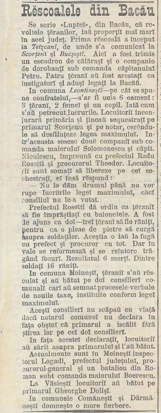 În ziarul Universul din 27 aprilie (9 mai stil nou) 1894 se relatează despre revoltele țăranilor contra „Legii Maximului”