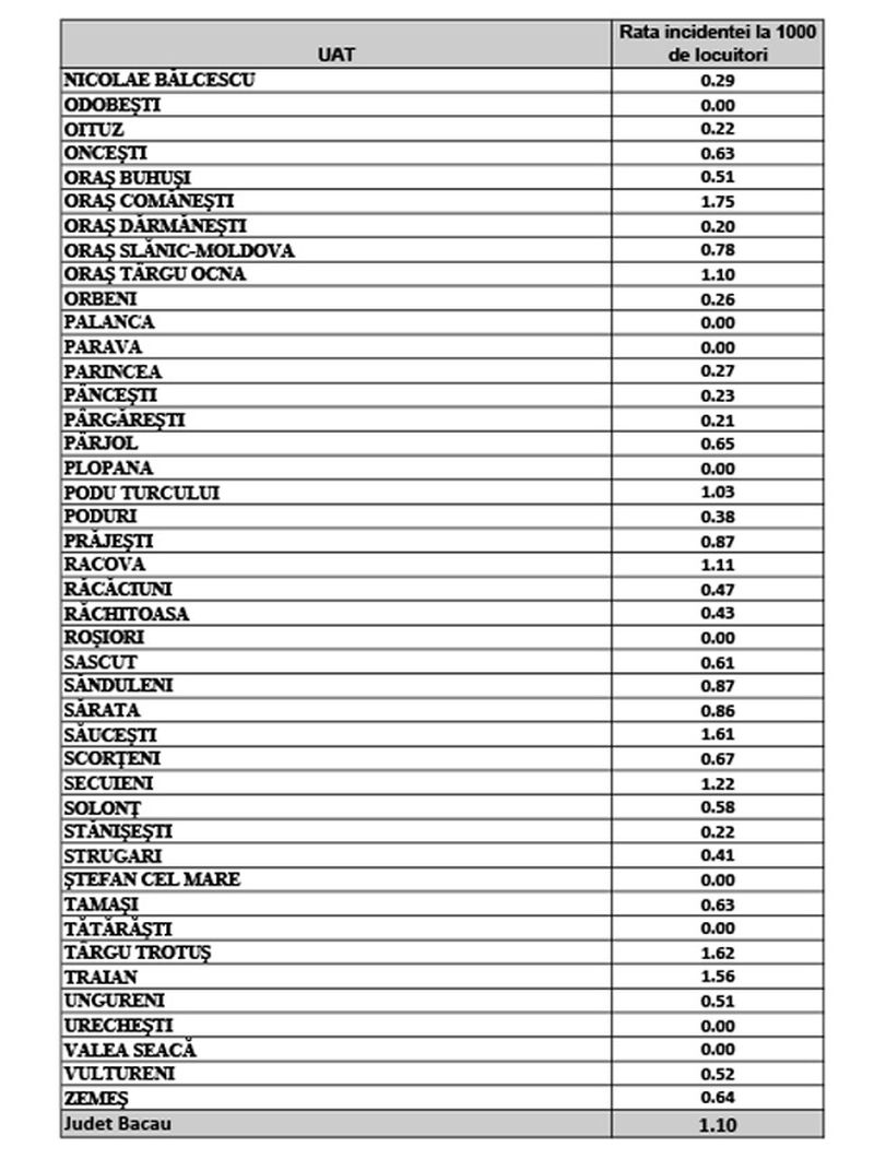 Direcția de Sănătate Publică Bacău actualizează zilnic situația ratei incidenței cumulative (RIC) privind infectările cu noul coronavirus, la mia de locuitori, în funcție de care se stabilesc scenariile de funcționare în școli, dar și eventuala carantinare a unei localități.