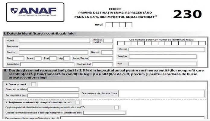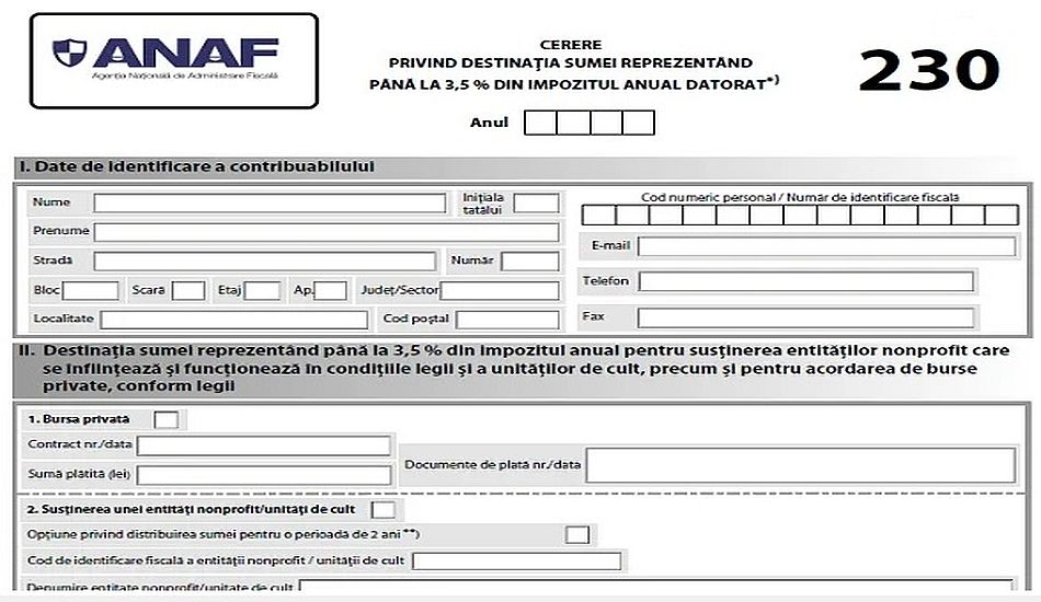 Formularul 230 are și el o formă schimbată, iar redirecționarea a 3,5% din impozitul pe venit se poate face o dată la doi ani, nu anual, cum se proceda până acum. Acest lucru va fi posibil prin bifarea căsuței special destinate acestei opțiuni din cadrul formularului 230. La finalul celor doi ani, cererea poate fi reînnoită.Iar pe lângă salariați și pensionari, pot utiliza acest formularși cei care obțin venituri din anumite activități independente, cum sunt cei care obțin venituri din chirii.