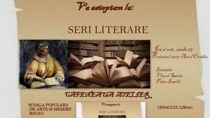 Prima seara din noul „sezon” al Serilor Literare va prilejui doritorilor o intalnire cu criticul literar Petre Isachi si scriitorul Viorel Savin, tema generala a serii fiind Proiectul Cultural 2017 – Anul Ovidiu, proiect initiat de Viorel Savin si sustinut pana acum, cel putin la nivel teoretic de mai multi reprezentanti ai vietii culturale bacauane.