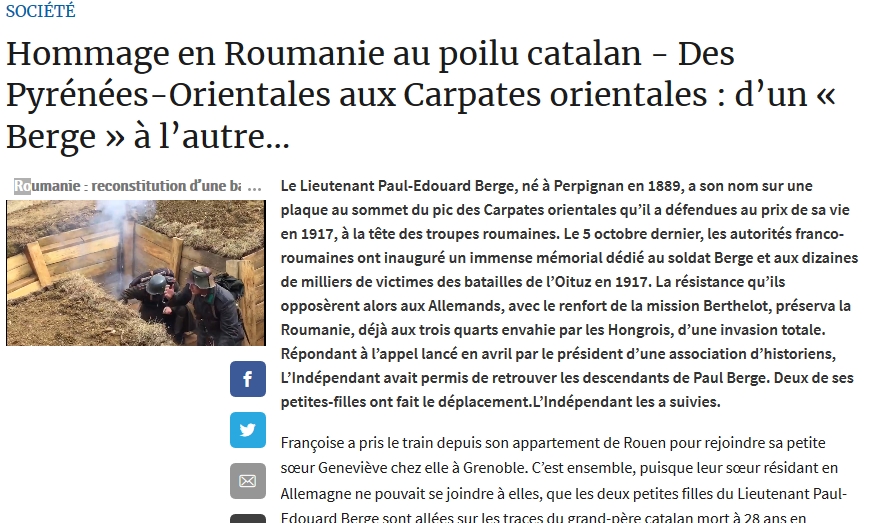 Iar reportajul începe astfel: „Numele locotenentului Paul-Edouard Berge, născut la Perpignan în 1889, apare pe o placă din vârful Carpaților Orientali pe care l-a apărat cu prețul vieții sale în 1917, în fruntea trupelor române. Pe 5 octombrie 2019, autoritățile franco-române au inaugurat un imens memorial dedicat locotenentului Berge și zecilor de mii de victime ale luptelor de la Oituz în 1917. Rezistența pe care au opus-o atunci germanilor, odată cu întărirea Misiunii Berthelot, a apărat România deja pe trei sferturi invadată de maghiari într-o invazie totală. Răspunzând apelului lansat în aprilie de președintele unei asociații de istorici, L’Indépendant a ajutat la găsirea descendenților lui Paul Berge. Două dintre nepoatele ei au făcut călătoria în România, iar L’Indépendant le-a urmat”.