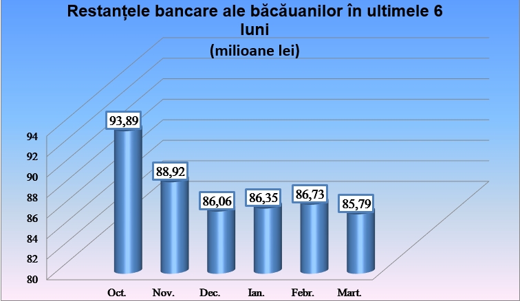 Conform datelor BNR, în Bacău ponderea restanțelor în total credite a ajuns la 1,97% în martie, față de 2% în luna februarie și 2,03% în ianuarie. În Regiunea Nord-Est, însă, ponderea a scăzut în martie, față de februarie, la 2,60 față de 2,66%. În octombrie 2017, proporția depășise 4%. Acum, în Regiune ponderea cea mai mare a restanțele în total credite o are județul Neamț (5,41%). În valoare, cele mai mari restanțe rămân cele din județul Iași, de 228,60 de milioane de lei.