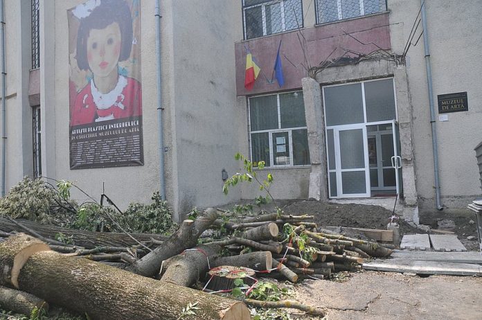 Zilele acestea, la Muzeul de Artă au început lucrările de refacere a intrării în muzeu, au fost tăiaţi doi arbori bătrâni (Dionis Puşcuţă, sef secţie artă, spera ca măcar unul să rămână în picioare), s-au dărâmat scările şi porticul de la intrare în muzeu. Consiliul Judeţean a aprobat sumele necesare pentru rezolvarea ineditei situaţii: amenajarea unei noi intrări, construirea gardului şi modernizarea platoului cu statui, alimentarea cu energie electrică, deoarece, între timp, a fost dărâmată şi clădirea din spatele muzeului, de la care era racordat muzeul.