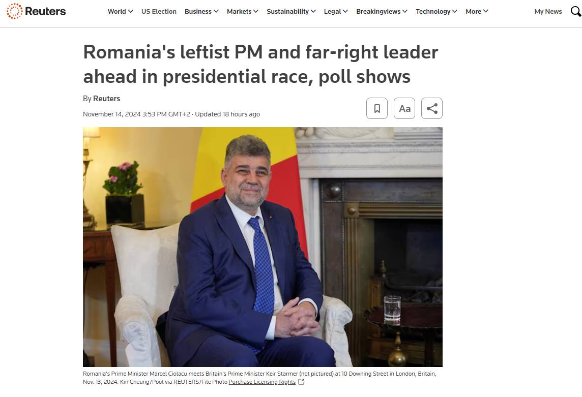 Prim-ministrul României, Marcel Ciolacu, lider al Partidului Social Democrat (PSD), și George Simion, liderul formațiunii de extremă dreapta Alianța pentru Unirea Românilor (AUR), sunt favoriții cursei prezidențiale, potrivit unui sondaj realizat de INSCOP. Cei doi sunt așteptați să se confrunte în turul al doilea, după alegerile din 24 noiembrie, scrie agenia de pres Reuters.