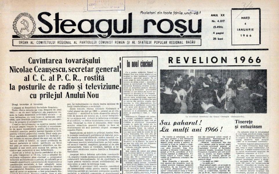 Numărul din 1 ianuarie 1966 al ziarului Steagul roșu constituie un document amplu despre felul în care trecerea dintre ani a fost reflectată în presa regională a României anilor ’60. Articolul – de fapt un ansamblu de relatări – surprinde Revelionul nu ca experiență individuală, ci ca eveniment colectiv, desfășurat simultan în mai multe spații sociale: instituții de învățământ, întreprinderi industriale, unități agricole, restaurante, case de cultură și cantine.