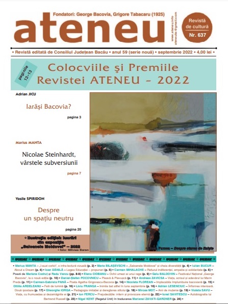 Ediţia cu nr. 637, pe luna septembrie, a Revistei ATENEU se deschide cu evenimentul lunii: Colocviile şi Premiile Revistei – 2022, integrate în manifestare anuală BAC Fest – Festivalul Naţional „George Bacovia”, organizat, anul acesta, de Biblioteca judeţeană „Costache Sturdza”.