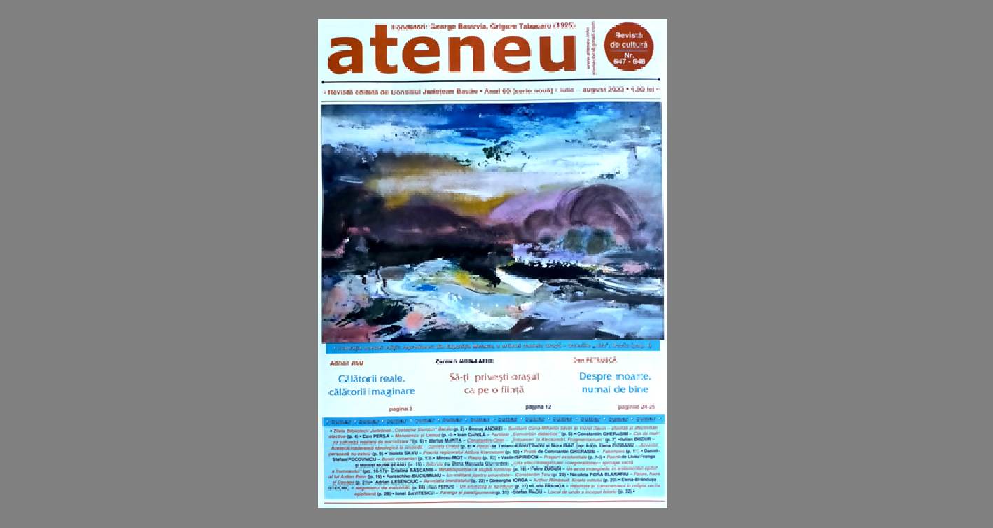 Am început lectura cu o cronica – eseu a criticului literar Marius Manta, care are ca subiect recenta apariție editorială, semnată de profesorul, criticul și istoricul literar Constantin Călin: „Întoarceri la Alecsandri. Fragmentarium” (Editura BABEL, 2023). Argument: Volumul este „expresia unei datorii intelectuale pentru un simbol al locului”, clarifică Constantin Călin în Prefață demersul critic, iar Marius Manta, atent la context și structura cărții scrie: „Constantin Călin girează un spectacol al ideilor vii, prezentate polemic. […] E deopotrivă atent la contemporanietate, înregistrând și comentând aspecte sociale, morale, psihilogice, literare, climatice etc. și poate, și o nouă cale de lectură.” A doua recomadare este tot o carte a unui băcăuan, mai precis a unei băcăuance, este vorba de volumul „Întoarcerea. De vorbă cu tata” (București, Editura Eikon, 2023), semnată de Oana Mihaela Savin. Cronica aparține criticului Petruș Andrei, din care am reținut: „Doi scriitori, tatăl (scriitorul, dramaturgul și poetul Viorel Savin – n.a) și fiica, înzestrați cu talent, inteligență și voință, se angajează într-un dialog afectiv și afin vorbind despre […] arta creației și a conversației, despre înzestrarea artistică și despre impostori, despre invidie și despre delatori.” Cum vara nu s-a terminat, mai puteți citi în cele 32 de pagini ale revistei ATENEU: Adrian Jicu – Călătorii reale, călătorii imaginare; Dan Perșa – Manolescu şi Urmuz; Ioan Dănilă – Fertilele „Convorbiri didactice”; Constantin Gherasim – Cât de mult ne schimbă reţelele de socializare?; Carmen Mihalache – Să-ţi priveşti oraşul ca pe o fiinţă; Nicoleta Popa Blanariu – Patos, haos şi Danaos; Gheorghe Iorga – Arthur Rimbaud. Feţele mitului; Dan Petrușcă – Despre moarte, numai de bine; Ion Fercu – Un arheolog al spiritului; Marius MANTA – „Alegria” – un album de artă dedicat pictorului Dumitru Macovei, căruia Cornel Simion Galben, la rubrica Personalităţi băcăuane îi acordă o pagină: viața și opera unui mare artist, aflat astăzi la apogeul creației, cunoscut în lumea întreagă. Și, pe ultima pagină, un excelent reportaj semnat de Ștefan Radu, care a fost în Turcia și ne povestește despre „Locul de unde a început Istoria”.