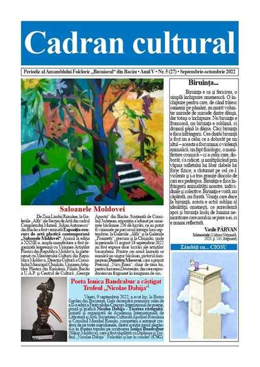 Revista ,,Cadran cultural”, periodic al Ansamblului folcloric ,,Busuiocul” din Bacău (Septembrie – octombrie 2022, Nr. 5), prezintă în primele pagini, două evenimente de tradiție ale vieții culturale băcăuane: Colocviile revistei ,,Ateneu” și Festivalul Național ,,George Bacovia”, articole semnate de Cornel Simion Galben, redactorul-șef al publicației. Și tot domnia sa, reușește, ca de fiecare dată, să ne aducă în prim plan o seamă de personalități băcăuane născute sau trecute la cele veșnice în lunile septembrie și octombrie: Criticul și istoricul literar Ion M. Gane (1902 – 1979), poetul-grafician Viorel Florin Costea (n. 4 octombrie 1962), compozitorul și dirijorul Ioan Alexnadrescu (1912 – 1999), scriitorul Ioan Alecu (1917 – 2000), medicul Eduard Apetrei (n. 11 octombrie 1937), poeta Loredana Dănilă (n. 21 octombrie 1972). Un foarte frumos portret i-l face maestrului Ovidiu Bălan, muzicologul Ozana Kalmuski-Zarea, în articolul ,,Ovidiu Bălan – inima muzicală a Bacăului”, cel care, la mijlocul lunii septembrie a deschis cea de-a 66-a stagiune muzicală! Poetul Dan Sandu îi dedică un ,,Cântec de prieten” scriitorului Romeo Tarhon, la zi aniversară, în timp ce un alt poet, Ion Dinvale, deschide o pagină de ,,Contabilitate” a păcatelor și a virtuților, într-un inedit eseu filosofic. Ionica Bandrabur, premiata poetă slăniceană menționată în această revistă, va fi prezentată mai pe larg, într-un material care va fi publicat în cotidianul ,,Deșteptarea”.
