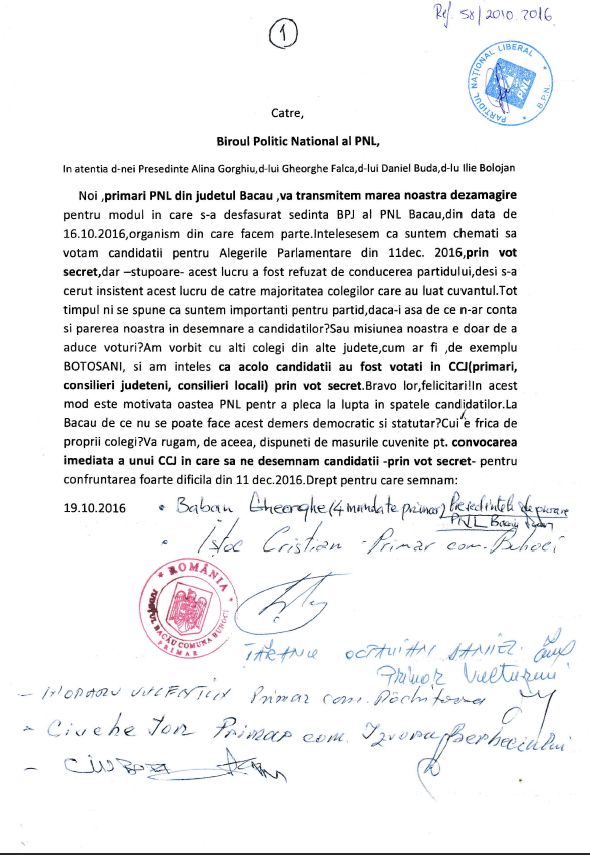 Tot timpul ni se spune ca suntem importanti pentru partid, dar daca-i asa, de ce nu ar conta si parerea noastra in desemnarea candidatilor? Sau misiunea noastra este doar de a aduce voturi? In alte judete s-a respectat votul secret. Bravo lor, felicitari! Cerem convocarea imediata a unui Birou Politic Judetean in care sa ne desemnam candidatii prin vot secret”, se spune intr-un memoriu trimis in 19 octombrie conducerii nationale, semnat de Gheorghe Baban, fost primar timp de patru mandate la Oncesti, presedinte de onoare al PNL Bacau, primarul Traian Ghergheluca, din Traian, viceprimarul Lucian Husanu, tot din Traian, primarul Calin Ciubotaru, din Itesti, primarul Cristian Istoc, din Buhoci, primarul Daniel Octavian Taranu, din Vultureni, din Rachitoasa, primarul Ion Ciuche, din Izvoru Berheciului.