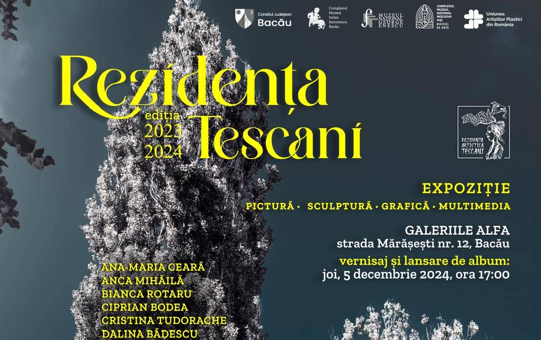 La Galeriile „Alfa” ale Muzeului de Artă din cadrul Complexului „Iulian Antonescu” Bacău va avea loc joi, 5 decembrie 2024, ora 1700, manifestarea cuprinzând vernisajul și lansarea albumului Rezidența Tescani – edițiile 2023-2024.