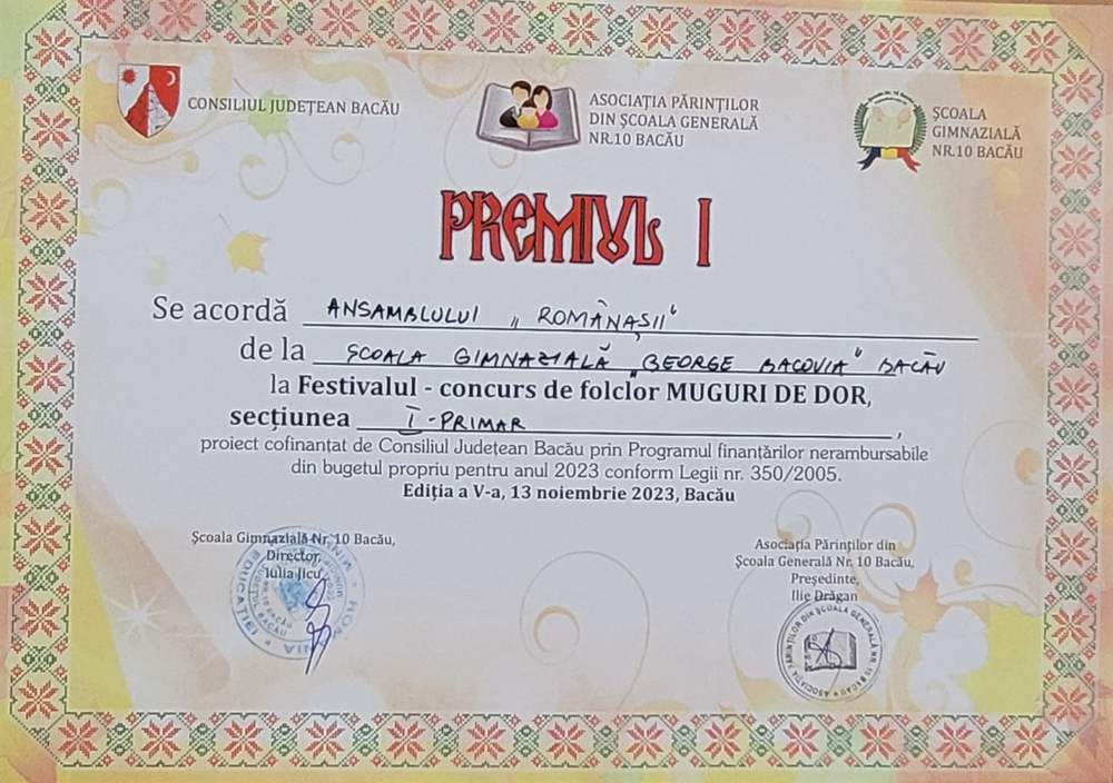 Între cei care au performat, la loc de cinste a fost și Ansamblul „Românașii” format din elevii de clasa a III-a de la Școala Gimnazială „George Bacovia” Bacău, coordonați de înv. Pamfil Doinița, grup care a reușit să obțină locul 1 la secțiunea „I – Primar”.