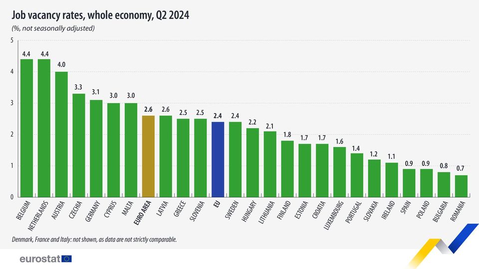 În al doilea trimestru al anului 2024, rata locurilor de muncă vacante din Uniunea Europeană a fost de 2.4%, conform datelor publicate de Eurostat, oficiul de statistică al Uniunii Europene. Aceasta reprezintă o scădere față de 2.6% în primul trimestru al anului și față de 2.9% în același trimestru al anului precedent (2023). La nivelul zonei euro, rata a fost de 2.6%, în scădere față de 2.9% în primul trimestru și de 3.1% în al doilea trimestru din 2023.