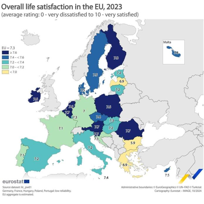 În 2023, satisfacția generală a vieții a fost evaluată, în Uniunea Europeană, în medie, la 7.3 puncte din 10. Acesta este un indicator care dezvăluie cum percep cetățenii calitatea vieții lor, iar România a surprins pe toată lumea, poziționându-se printre țările de top, cu un scor impresionant de 7.7!