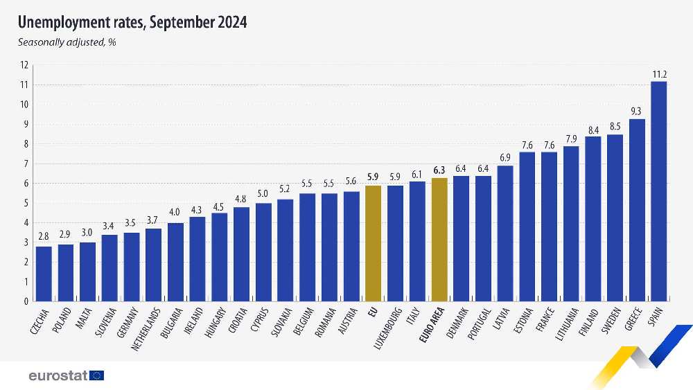 În luna septembrie 2024, rata șomajului ajustată sezonier din zona euro s-a menținut la 6,3%, la fel ca în luna august a aceluiași an, dar în scădere față de 6,6% înregistrată în septembrie 2023. În întreaga UE, rata șomajului a fost de 5,9%, stabilă comparativ cu luna anterioară și mai scăzută decât rata de 6,1% din septembrie 2023. Aceste cifre arată o ușoară ameliorare a pieței muncii în comparație cu anul precedent.