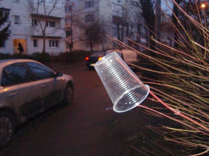 Daca gasesti unul ai scapat de resturi, daca nu, te vezi nevoit sa apelezi la artificii/situatii … ca in imaginea alaturata. Paharul asezat in gardul viu, a atras atentia câtorva trecatori, insa, dincolo de câteva comentarii, nu s-a simtit niciunul sa-l ia si sa-l arunce la un cos de gunoi, pentru ca nu exista asa ceva.