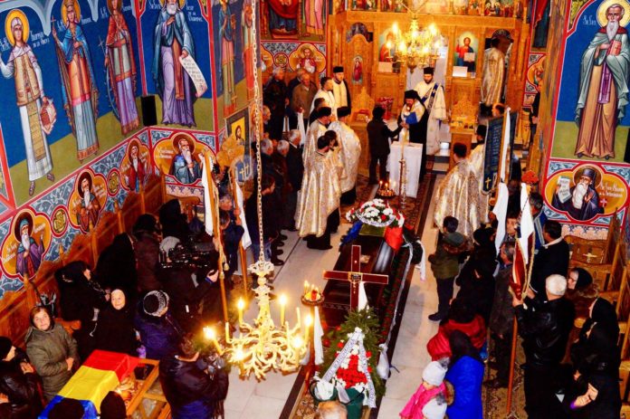 Cu binecuvântarea ierarhului locului, a Înaltpreasfințitului Părinte Ioachim Arhiepiscopul Romanului și Bacăului, slujba înmormântării a fost oficiată de către Preasfințitul Părinte Macarie al Europei de Nord, înconjurat de un sobor de preoți.