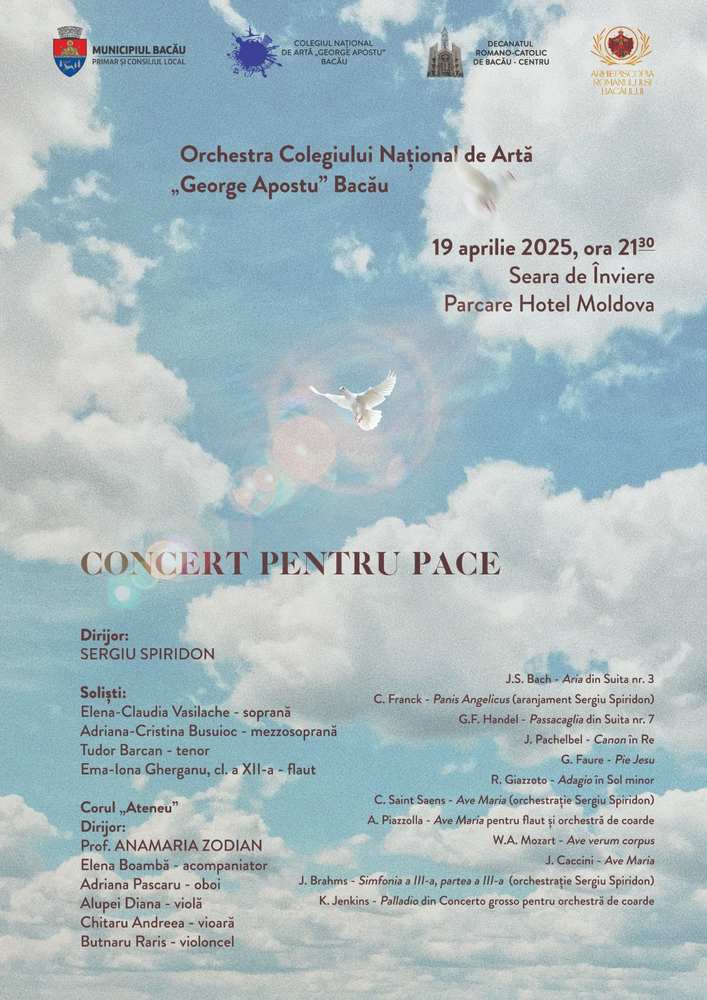 Municipiul Bacău, alături de Colegiul Național de Artă „George Apostu”, organizează evenimentul-concert „RUGĂCIUNE PENTRU PACE”, un recital artistic susținut de elevii colegiului și invitați speciali.