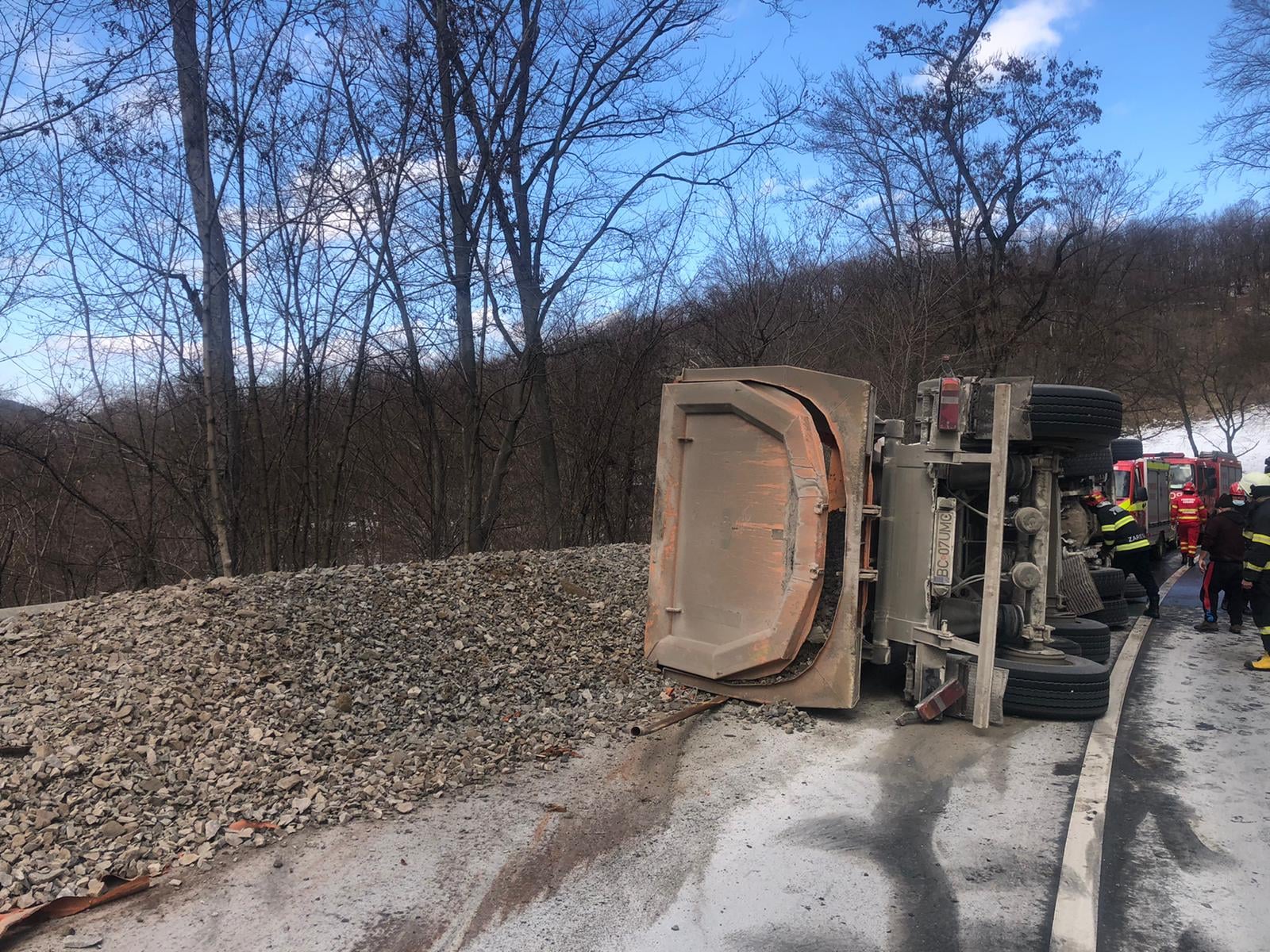 O basculantă încărcată cu pietriș s-a răsturnat, marți, pe DN 11 Bacău-Onești, în zona localității Măgura, județul Bacău, blocând astfel circulația în ambele direcții.