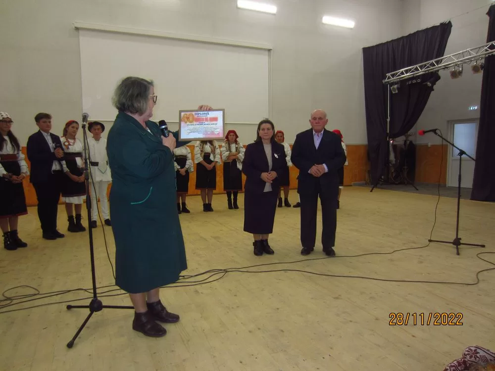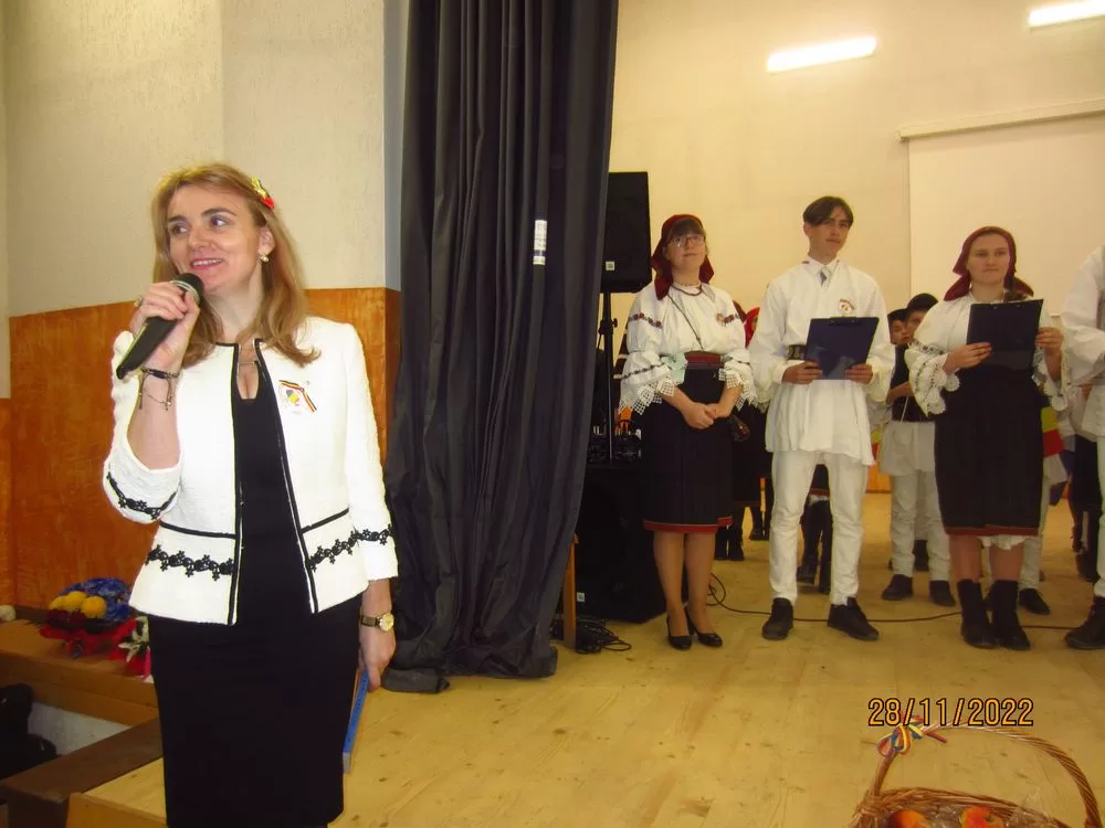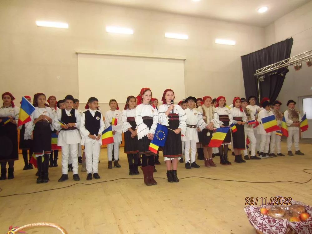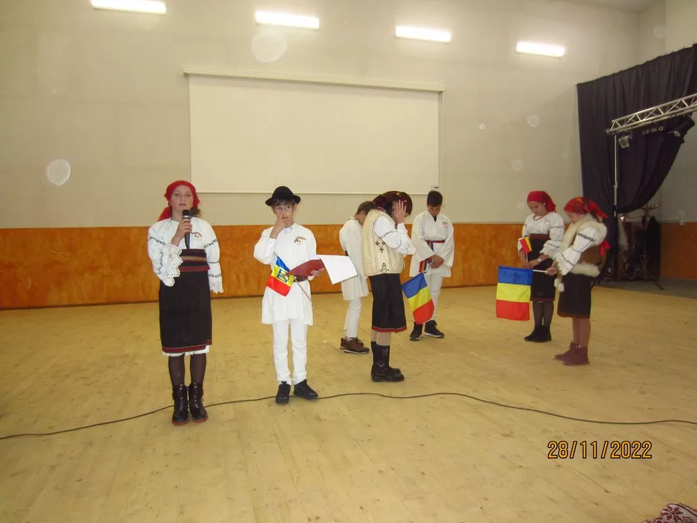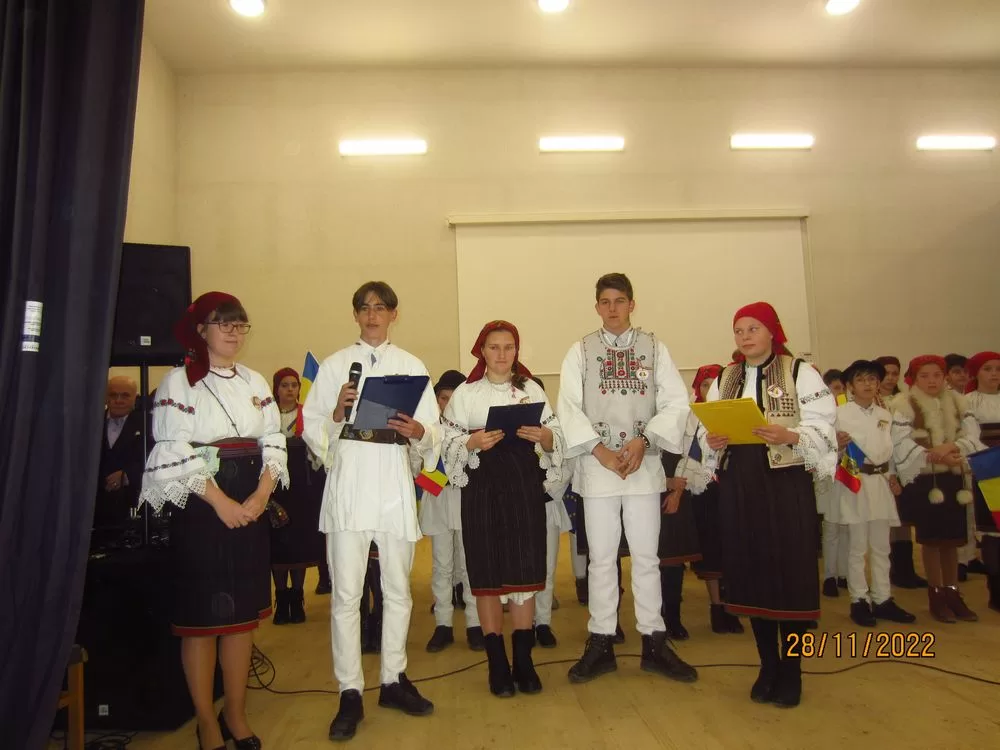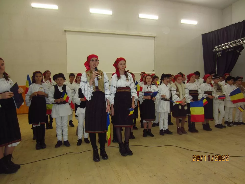 Aşa ne-a cerut Iuliana Ieşan, directoarea Liceului Tehnologic Făget, comuna Ghimeş-Făget, în deschiderea programului de luni, 28 noiembrie, dedicat zilei de 1 Decembrie şi subsumat „Conexiunilor culturale” (proiectul Centrului Judeţean pentru Conservarea şi Promovarea Culturii Tradiţionale Bacău). Cei care au ascultat-o cu devotament au fost gimnaziştii şi liceenii, care în finalul spectacolului au coborât de pe scena Căminului Cultural, într-o splendidă horă românească şi arborând mulţime de steaguri tricolore. Mai înainte, vreme de 2 ore, 2 minute şi 43 de secunde (cât a arătat reportofonul meu, lacom să înregistreze tot), s-au petrecut multe momente memorabile: cântece tematice (pregătite de profesoara Annamaria Tanko), secvenţe alegorice (provinciile istorice româneşti, figurate de eleve din clasa a IX-a), dansuri populare şi numeroase momente poetice. Nota bene: toate textele reproduse de elevi au fost memorate, incluzând aici şi pe cele care însoţeau muzica.