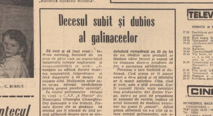 Un astfel de episod a fost consemnat în Steagul Roșu din 28 februarie 1970, când o știre aparent banală din gospodăria colectivă s-a transformat într-o mică epopee zoologică: o pisică ar fi ucis 60 de găini.