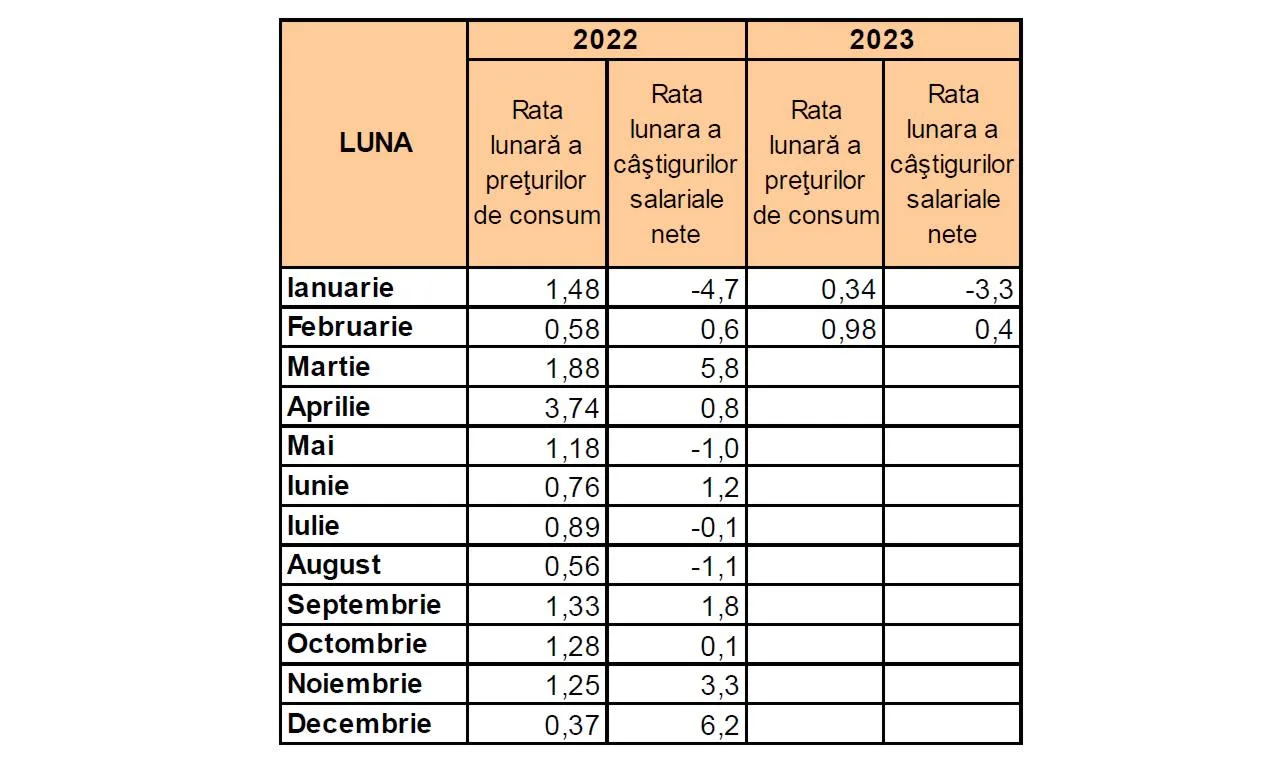 Rata lunară a prețurilor de consum a fost, anul trecut, mai mare decât rata lunară a câștigurilor salariale nete. Acest lucru înseamnă că prețurile au crescut mai rapid decât veniturile, ceea ce a dus la o scădere a puterii de cumpărare a oamenilor.