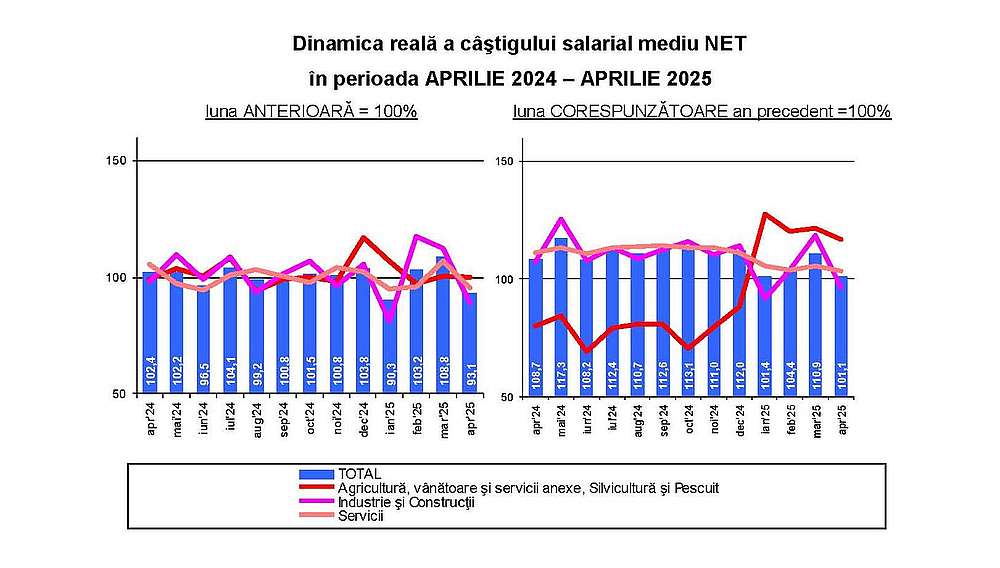 Comparativ cu luna martie 2025, salariile nete în județul Bacău au suferit o scădere de 6,9% în termeni reali (ajustați cu inflația). Totuși, dacă ne raportăm la aceeași lună a anului precedent, aprilie 2024, se constată o creștere modestă de 1,1% în câștigul salarial net.