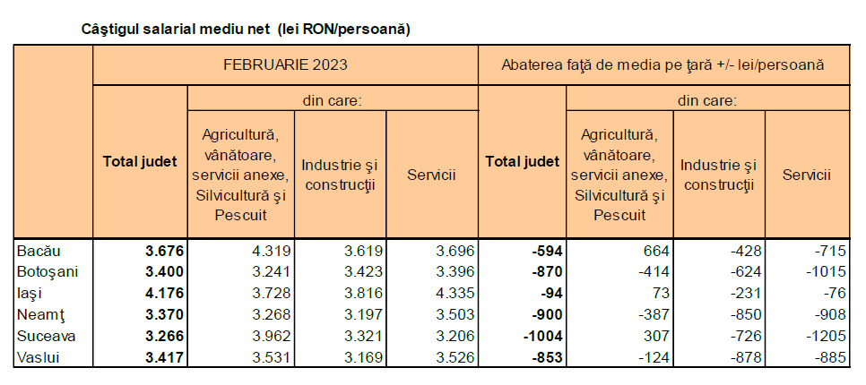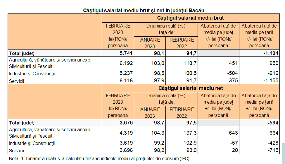 Conform Direcției Județene de Statistică Bacău, la nivelul economiei naţionale, câştigul salarial mediu brut în luna februarie 2023 a fost de 6.845 lei, cu 0,2% mai mult decât în luna anterioară si cu 13 % mai mult decât în februarie 2022. Cu toate acestea, în termeni reali, salariul brut a scăzut ci 0,8% față de luna anterioară și cu 2,3% față de februarie 2022. Câştigul salarial mediu brut cel mai mare s-a înregistrat în activitatea “Activităţi de servicii în tehnologia infor-maţiei, activităţi de servicii informatice” (16.078 lei), iar cel mai mic în “Hoteluri şi restaurante ” (3.811 lei). Câştigul salarial mediu net la nivelul economiei naţionale a fost în luna februarie 2023 de 4.270 lei, cu 4,8% mai mare decât în în perioada similară a anului trecut, dar, în termeni reali, mai mic cu 0,6% atât față de ianuarie 2023 cât și de februarie 2022.