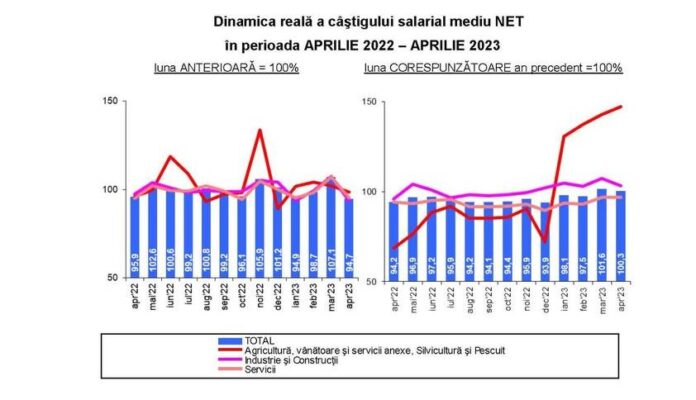 Faţă de luna MARTIE 2023 câştigul salarial mediu net la nivelul judeţului a scăzut, în preţuri comparabile, cu -5,3%, iar faţă de luna APRILIE 2022 acesta a înregistrat o creştere, în preţuri comparabile, cu +0,3%.