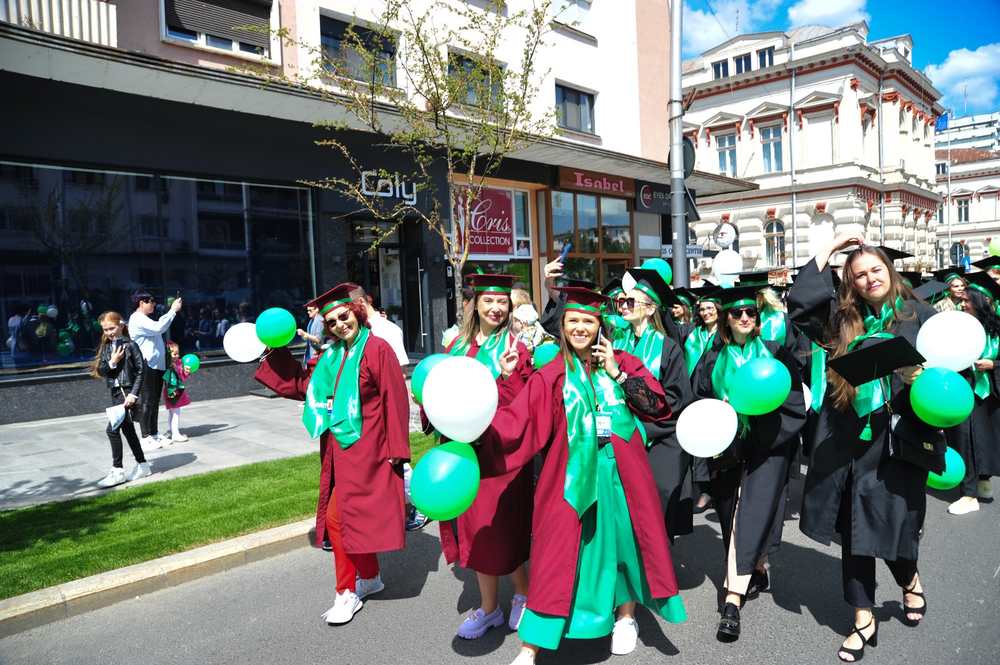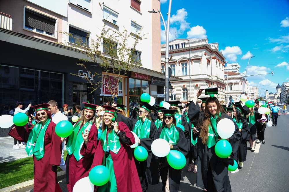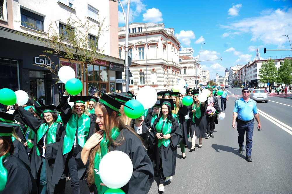 Sute de tineri în robe de absolvire, cu flori și baloane colorate, acompaniați de majoretele și de muzica Colegiului National de artă „George Apostu”, au străbătut orașul începând din Piața Tricolorului până la Central Plaza – locul unde urmau să rostească Jurământul lui Hipocrate.