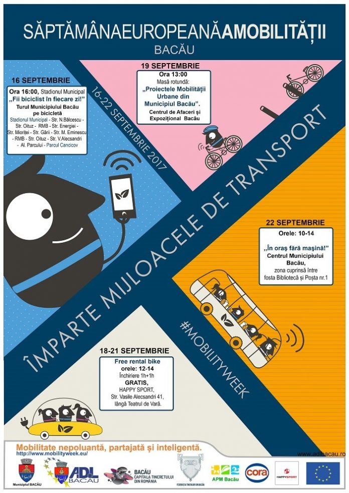 În perioada 16-22 septembrie se va desfăşura în municipiul Bacău o nouă ediţie a „Săptămânii Europene a Mobilității” (European Mobility Week) – a XVI-a la nivel european și a III-a la nivel local, cu tematica „Mobilitate nepoluantă, partajată și inteligentă. (Clean, shared and intelligent mobility)”. Organizatorii evenimentului sunt Municipiul Bacău, Agenţia de Dezvoltare Locală (ADL) şi Agenţia pentru Protecţia Mediului Bacǎu. Parteneri: Direcţia de Sănătate Publică Judeţeană, Inspectoratul Şcolar Judeţean, SC Transport Public, Federația Tinerilor din Bacău, Cora și Happy Sport.