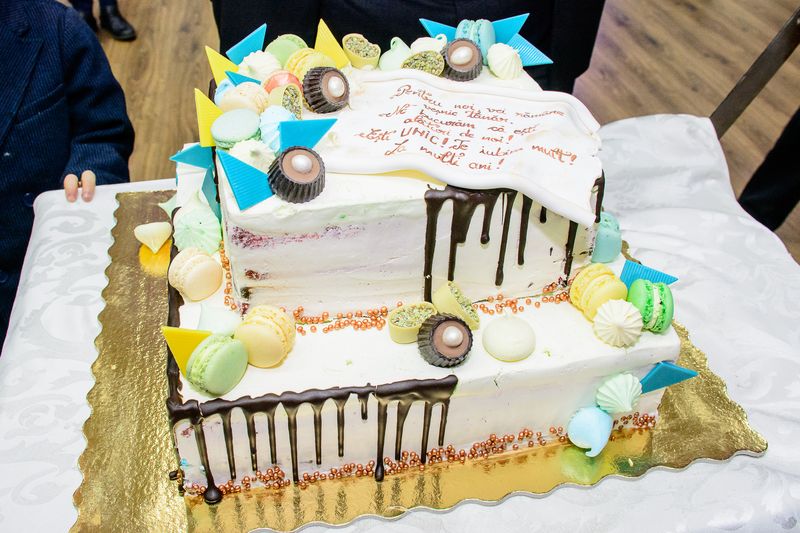 Și cum se putea finaliza un eveniment de aniversare dacă nu cu un tort pe măsură. Patiserii s-au întrecut pe ei și au supraetajat felurite straturi de blat, de ciocolată și de frișcă, peste care au derulat un veritabil hrisov din ciocolată albă, pe care au scris mesajul familiei către sărbătorit: „Pentru noi vei rămâne veșnic tânăr. Ne bucurăm că ești alături de noi! Ești UNIC! Te iubim mult! La mulți ani!”. În jurul hrisovului, mulțime de bezele, fondante și macarons, printre care au tronat, câteva zeci de secunde, artificiile care au făcut din atmosfera evenimentului un moment magic. Toate emoțiile sărbătoritului și ale invitaților au fostcaptate de camerele video și foto cu implicarea și dedicarea celor de la AlaZ Services Moinești.